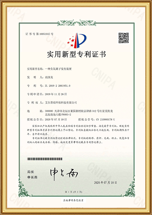 • 實用新型專利證書(一種負氧離子發生裝置)